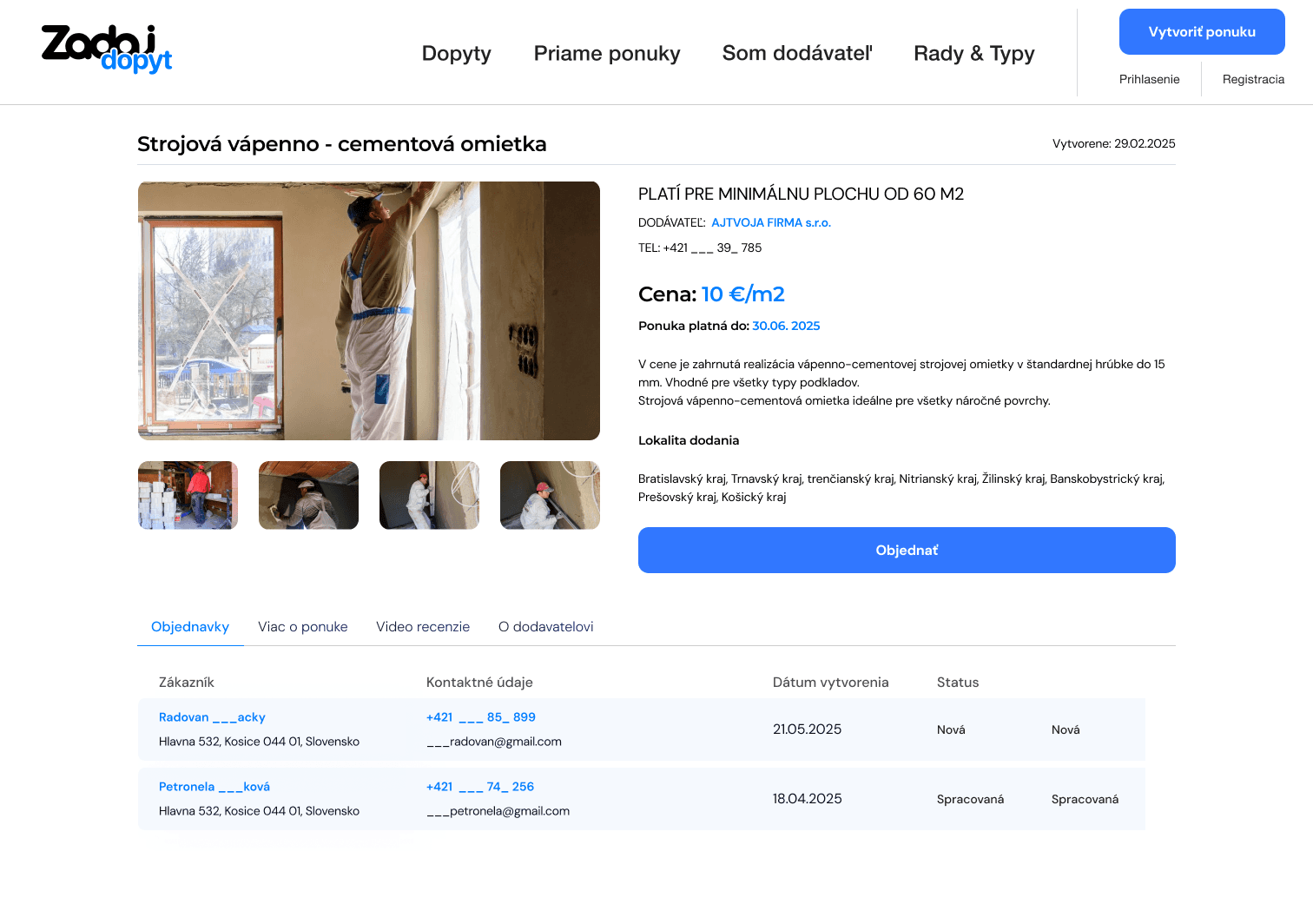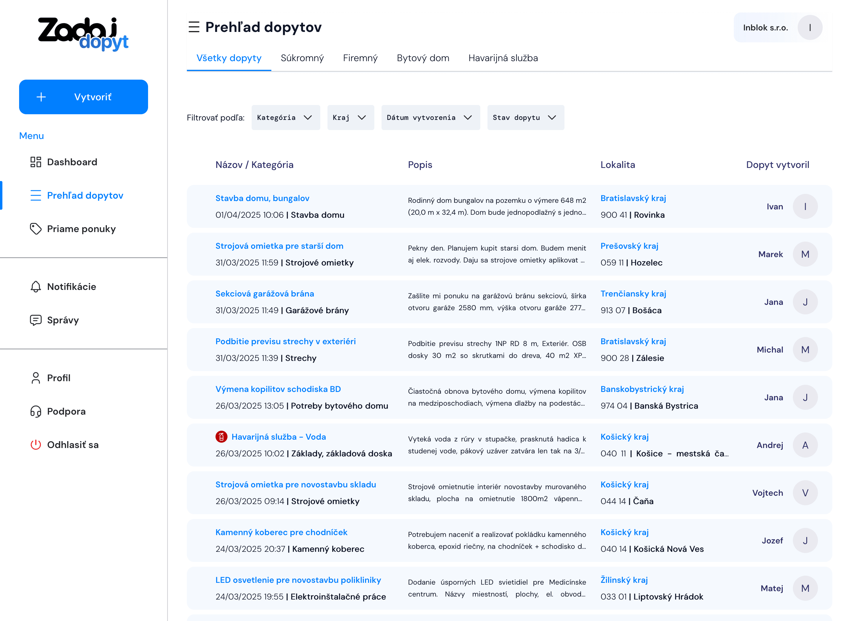 Dopyty súkromných osôb, zákazky správcov budov, firiem, inštitúcií a havarijné služby na jednom mieste.